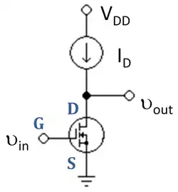 In electronics, a common-source amplifier is one of three basic single-stage field-effect transistor (FET) amplifier topologies, typically used as a voltage or transconductance amplifier. The easiest way to tell if a FET is common source, common drain, or common gate is to examine where the signal enters and leaves. The remaining terminal is what is known as "common". In this example, the signal enters the gate, and exits the drain. The only terminal remaining is the source. This is a common-source FET circuit. The analogous bipolar junction transistor circuit may be viewed as a transconductance amplifier or as a voltage amplifier. (See classification of amplifiers). As a transconductance amplifier, the input voltage is seen as modulating the current going to the load. As a voltage amplifier, input voltage modulates the current flowing through the FET, changing the voltage across the output resistance according to Ohm's law. However, the FET device's output resistance typically is not high enough for a reasonable transconductance amplifier (ideally infinite), nor low enough for a decent voltage amplifier (ideally zero). As seen below in the formula, the voltage gain depends on the load resistance, so it cannot be applied to drive low-resistance devices, such as a speaker (having a resistance of 8 ohms). Another major drawback is the amplifier's limited high-frequency response. Therefore, in practice the output often is routed through either a voltage follower (common-drain or CD stage), or a current follower (common-gate or CG stage), to obtain more favorable output and frequency characteristics. The CS–CG combination is called a cascode amplifier.