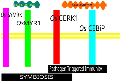 Some plant proteins are suspected to recognise Myc-factors, and the rice OsCERK1 Lysin motif (LysM) receptor-like kinase, is one of them.[15]