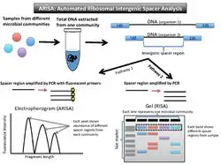 (Automated) ribosomal intergenic spacer analysis, or (A)RISA (Figure 3), takes advantage of the fact that prokaryotic DNA encodes for two highly conserved genes, the 16SrRNA gene and the 23SrRNA gene. These encode the small and large subunit genes in the rRNA operon. Between these two genes, there is an internal transcribed spacer (ITS) region. Due to the fact it is non-coding for proteins, it is a highly variable nucleotide sequence and length. Once DNA is isolated from a community, PCR amplifies this spacer region. The fragments can be run out on a gel (RISA), or the fluorescent primers can be translated into peaks in abundance of the different fragments lengths on an electropherogram (ARISA).[16][17]