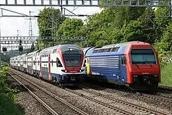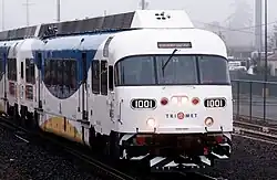 Commuter rail or suburban rail is a passenger rail service that primarily operates within a metropolitan area, connecting commuters to a central city from adjacent suburbs or commuter towns.[1][2][3] Commuter rail systems can use locomotive-hauled trains or multiple units, using electric or diesel propulsion.[2] Distance charges or zone pricing may be used.