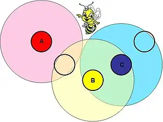 An illustration of spatial structure in nature. The strength of the interaction between bee colonies is a function of their proximity. Colonies A and B interact, as do colonies B and C. A and C do not interact directly, but affect each other through colony B.