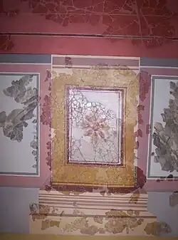 In the centre of the city is the House of the Griffins, built in the middle of the 1st century and in use until the 4th century, when it was destroyed by an accidental fire. It was one of the best domus in the city, with unusual comforts (a fireplace in room F and a water storage and distribution system). It had a large area (900 m²), with a large inner courtyard (99 m²) surrounded by a peristyle with twelve columns (two of them double) leading to a series of rooms. Wall paintings of all kinds have been found in them, among which some well-preserved ones stand out.[13] Those on the west wall of room E, the tablinum of 48.6 m², the guests and clients reception room, are of the second Pompeian style, in fashion during Hadrian's time (117-138). They represent a simulated architecture of 7.6 × 4.9 m with two Ionic columns on a plinth that imitates marble panels, among which an elaborate yellow plinth supporting a framed flower in its centre stands out.