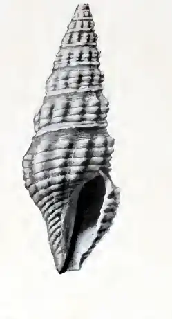 Sculpture.- The external sculpture is vigorous, both axial and spiral. The axial ribs are rather strongly elevated, rounded, somewhat undulatory and slightly protractive, 12 to 14 in number on the later whorls, persisting with undiminished strength to the anterior suture but quite abruptly evanescent posteriorly at the margin of the fasciole. On the body whorl they are weakening a little in front of the periphery and becoming obsolete before reaching the pillar and, in the older forms, irregular or altogether obsolete toward the aperture. Intercostal areas are concave, narrower than the ribs. The spiral sculpture consists of broadly arched, rather prominent, primary fillets, uniform in strength on both the costal and the intercostal areas, 9 to 11 in number on the ultima, 3 or 4 upon the penultima, usually, though not always, equal or sub-equal in size and spacing. The intercalaries are absent in the type but present, as a rule, to the number of 1, 2, or 3 between the primaries of the later whorls. The posterior fasciole is obscurely undulated anteriorly by the axial sculpture, spirally threaded with 4 to 6 fine, close-set lirae with 1 or 2 stronger cords at the posterior margin, directly in front of the suture line. The anterior canal is sculptured with 4 to 6 crowded lirae. Aperture : the aperture is narrow, obliquely lobate, obtusely angulated at the posterior commissure. The outer lip is somewhat flaring. The posterior siphonal notch is very narrow, but rather deep. The inner lip is gently excavated at the base of the body whorl. The columella is straight, moderately long, simple. The parietal wall and the columella are heavily reinforced. The anterior canal is rather long and broad, obtusely truncate at the extremity.[2]