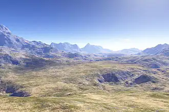 Not only do animated images form part of computer-generated imagery; natural looking landscapes (such as fractal landscapes) are also generated via computer algorithms. A simple way to generate fractal surfaces is to use an extension of the triangular mesh method, relying on the construction of some special case of a de Rham curve, e.g., midpoint displacement.[13] For instance, the algorithm may start with a large triangle, then recursively zoom in by dividing it into four smaller Sierpinski triangles, then interpolate the height of each point from its nearest neighbors.[13] The creation of a Brownian surface may be achieved not only by adding noise as new nodes are created but by adding additional noise at multiple levels of the mesh.[13] Thus a topographical map with varying levels of height can be created using relatively straightforward fractal algorithms. Some typical, easy-to-program fractals used in CGI are the plasma fractal and the more dramatic fault fractal.[14]
