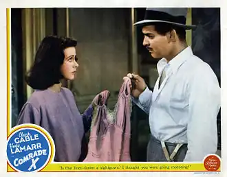 Comrade X is a 1940 American comedy spy film directed by King Vidor and starring Clark Gable and Hedy Lamarr. The supporting cast features Oskar Homolka, Felix Bressart, Sig Rumann and Eve Arden. In February 2020, the film was shown at the 70th Berlin International Film Festival, as part of a retrospective dedicated to King Vidor's career.[2]
