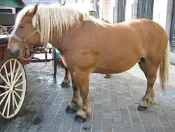 The Comtois horse breed is an old breed of horse that is believed to have descended from horses brought by the Burgundians of northern Germany to France during the fourth century.[1] It is believed that they have been bred in Franche-Comté and in the Jura Mountains since the sixth century. In the Middle Ages they were used as war horses.[3] They were bred in Franche-Comté and in the Jura Mountains[1] In the 19th century, other draft horses such as the Norman, Boulonnais, and Percheron were bred into the Comtois, and more recently the Ardennes was used to produce a stronger horse with better legs. Today, they are second only to the Belgian Draught in number in France.[1]
