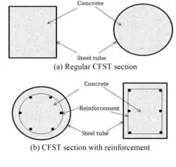 The pipes used can be circular or rectangular in section[2] and might contain further reinforcement inside, or the concrete can be sandwiched between two concentric tubes in a concrete-filled double skin steel tubular (CFDST) construction.[4]