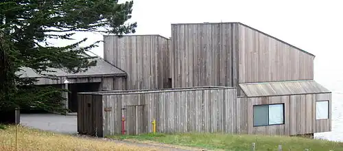 Condominium 1 is located on the edge of a cliff overlooking the Pacific. It is a complex of ten condominium units, intended to be seen as a single structure. The design was inspired by barns and other farm buildings in the region and, with the help of landscape architect Lawrence Halprin, was built to take into account the local ecology.[3] The timber frame is clad in vertical redwood siding,[4] with vertical forms resembling mine structures anchoring a series of sloping roofs that descend toward the ocean, perforated by skylights. Windows are plain openings without trim or mullions. There are no eaves or significant fascia trim. On the uphill side the building wraps around a courtyard that houses the units' garages. Interior spaces feature the full range of MLTW-developed design elements.