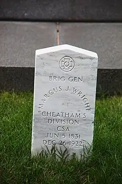 On June 5, 1899, Lewis and other Confederate veterans sent a petition to President McKinley asking that the Confederate dead at Arlington be disinterred and reburied in a "Confederate section". McKinley approved of the idea.[17] Former Confederate Brigadier General Marcus Joseph Wright (by 1898 an agent of the War Department collecting Confederate war records) drafted legislation to approve the reinterments, and Senator Joseph Roswell Hawley (a former brevet major general of volunteers for the Union) introduced it in Congress.[18] Congress approved the bill in 1900 and authorized $2,500 for the plan,[17] which specified that the reburials occur near the field where Spanish–American War dead had recently been interred.[18] McKinley signed the bill into law on June 6, 1900. A list of the dead at both Arlington and the Soldiers' Home was published so that families who wished to do so might remove their loved ones' remains from Arlington and reinter them closer to home.[17]