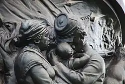 Ezekiel felt that the monument was the most important commission he ever worked on, and he refused all other work so that he could devote all his time to it.[83] He also discouraged visitors from coming to his Rome studio so that there would be little public discussion of his design.[83] Nonetheless, some changes were made in response to comments made by visitors to his workshop. For example, Ezekiel originally intended for the shield against which the fallen woman leans to be inscribed with the words "free trade" and "state's rights". He changed the words to "Constitution" after a visit to his studio by a friend.[98][m]