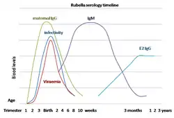 - Detection of infant rubella-specific IgG antibody[19] at higher levels (and persists for a longer time) than expected for passive maternal transmission