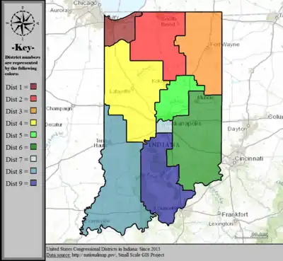 Table of United States congressional district boundary maps in the State of Indiana, presented chronologically.[3] All redistricting events that took place in Indiana between 1973 and 2013 are shown.