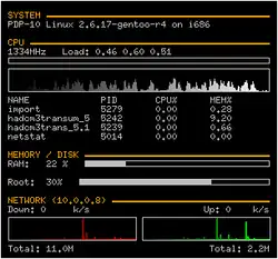 Conky is a free software desktop system monitor for the X Window System. It is available for Linux, FreeBSD, and OpenBSD.[3] Conky is highly configurable[4][5][6] and is able to monitor many system variables including the status of the CPU, memory, swap space, disk storage, temperatures, processes, network interfaces, battery power, system messages, e-mail inboxes, Arch Linux updates, many popular music players (MPD, XMMS2, BMPx, Audacious, etc.), weather updates, breaking news, and much more.[7] Unlike system monitors that use high-level widget toolkits to render their information, Conky is drawn directly in an X window. This allows it to be configured such that it consumes relatively few system resources.[8]