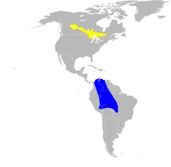 As mentioned earlier, the Connecticut warbler is an elusive species. Little is known about it outside of the breeding season as to this date, less than 25,000 individuals have been banded.[11] These birds migrate to the Amazon Basin in South America in winter. Specimens have been observed in Colombia (north & southeast), Venezuela (northeast & interior), Guyana (at the border), and Peru (South).[11] Connecticut warblers undertake different migratory routes in spring and in fall, an atypical behavior. In spring, they normally pass through the Midwest and only rarely migrate to the East Coast, but in fall, larger numbers of migrating birds move through the East Coast. Recently, the use of small tracking devices has enabled scientists to gather more data on the warbler's migration routes. They have discovered some individuals fly over open water like the Blackpoll warbler. More specifically, they recorded a previously undocumented two-day flight over the Caribbean to the Antilles.[11] This correlates with sightings of Connecticut warblers that have occurred in Bermuda, St. Thomas and St Martin. Haiti on the island of Hispaniola is also a popular stop, but records there are hard to find due to the terrain being rather remote and past humanitarian crises; it is also additionally threatened by the ongoing deforestation in both Haiti and the Dominican Republic.[11] There, they make a minimum of 48-hour stop (it usually lasts 5–7 days) in the Caribbean. This long migration over open water calls for strong selective pressures. A comparative study between the Connecticut warbler and the blackpoll warbler could help determine what selective pressures are present in these two species. This kind of migration also demands large reserves of fuel and this is why fat Connecticut warblers can be found on the East Coast in early fall.[11] It's also the reason why they make several stopovers on their way south.