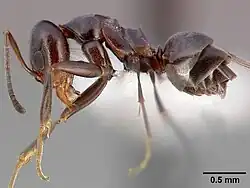 Dorymyrmex insanus is a species of pyramid ant, one of several species known as crazy ants, for their "frenetic" movement and swarming behavior.[2] It is found in hot, dry habitats in the southern parts of the United States, much of Central America, and tropical South America.[3][4][2] Dorymyrmex insanus is listed as Vulnerable by the International Union for Conservation of Nature (IUCN).[1]