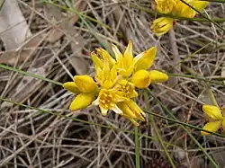 Conostylis aurea is a rhizomatous, tufted perennial, grass-like herb. It grows to a height of 0.15–0.4 metres (0.49–1.31 ft) and a width of about 0.3 metres (0.98 ft).[2] As with others in the genus, the leaves are strap-like and the flowers occur in clusters on stalks which arise from the base of the leaves. There are six tepals and six stamens, one at the base of each tepal-lobe.[3] In his notes on his original description of the species, John Lindley noted "Conostylis abounds the most in species, some of which are handsome but others are mere weeds..... C. aurea is a much handsomer species....flowers of a bright golden yellow."[4]