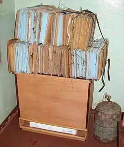 A herbarium is a collection of preserved plant specimens and associated data used for scientific study.[2] Originally, the word "herbarium" referred to books about medicinal plants. In 1700, French botanist Joseph Pitton de Tournefort used the word to describe a collection of dried plants and Carl Linnaeus continued to use this term in his work which is where the term caught on. Initially, herbarium collections were bound in volumes instead of on individual sheets as it is done today.[3] It is not exactly known how long dry plant specimens last in storage, but with proper conservation, they have been able to last many centuries. Specimens collected by Linnaeus in the eighteenth century and by Banks and Solander on the Endeavour voyage in 1788 are still excellently preserved.[4] The specimens may be whole plants or plant parts. These will usually be dried and pressed and mounted on a sheet of paper but, depending upon the material, may also be stored in boxes or kept in alcohol or other preservatives.[5]