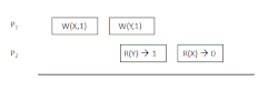 Example: Slow memory diagram depicts a slow consistency example. The first process writes 1 to the memory location X and then it writes 1 to the memory location Y. The second process reads 1 from Y and it then reads 0 from X even though X was written before Y.
