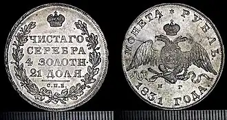 The Constantine ruble (Russian: Константиновский рубль, romanized: Konstantinovskiy rubl') is a rare silver coin of the Russian Empire bearing the profile of Constantine, the brother of emperors Alexander I and Nicholas I. It was prepared to be manufactured at the Saint Petersburg Mint during the brief Interregnum of 1825 but has never been minted in numbers and never circulated in public. The fact of its existence, classified in Russia until 1886,[1] leaked into European press in 1857.