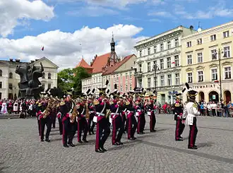 In modern Poland, this day, free from work, sees many parades, exhibitions, concerts and public figure speeches.[13] Most important Polish politicians participate in those festivities; for example in 2011 President of Poland, Bronisław Komorowski, Prime Minister of Poland, Donald Tusk, and Marshal of the Sejm, Grzegorz Schetyna, Marshal of the Senate, Bogdan Borusewicz, and Minister of National Defence, Bogdan Klich, took part in the festivities in Warsaw.[13] The official festivities in Warsaw or in other Polish cities in the presence of the President and important dignitaries would include flag flying, cannon salvos, reading of the constitution preamble, and singing a patriotic song from the November Uprising, Witaj, majowa jutrzenko (Welcome, May Dawn)[14] plus drill shows and the annual military parade.[13] Other events of the 2011 celebrations in Warsaw included a celebratory mass (see: The Most Holy Virgin Mary, Queen of Poland) in St. John's Archcathedral, Warsaw, and presidential awards for achievements in the field of advancing Polish culture.[13] It is also held in various other Polish cities as well.