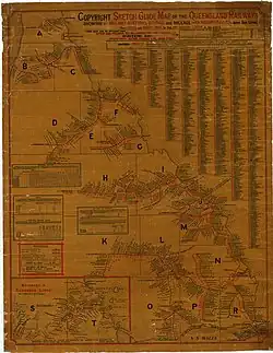 The first railway built in Queensland ran from Ipswich to Dalby. This line was opened to Bigge's Camp (now Grandchester) on 31 July 1865. It extended to Gatton in 1866 through multiple tunnels including the Victoria Tunnel, to Toowoomba in 1867 and to Dalby in 1868.[5] The railway was extended from Ipswich to Brisbane in 1876.[6] The line from Dalby had been extended to Chinchilla in 1878, Roma in 1880, Charleville in 1888 and Cunnamulla in 1898.