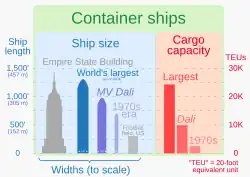 Today, about 90% of non-bulk cargo worldwide is transported by container by about 50,000 container ships.[22] Modern container ships can carry over 24,000 TEU. The largest container ships measure about 400 metres (1,300 ft) in length, and carry loads equal to the cargo-carrying capacity of sixteen to seventeen pre-World War II freighter ships.[23]