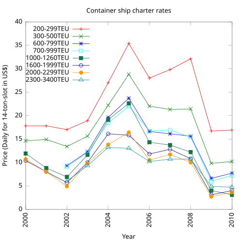 In recent years, oversupply of container ship capacity has caused prices for new and used ships to fall. From 2008 to 2009, new container ship prices dropped by 19–33%, while prices for 10-year-old container ships dropped by 47–69%.[64] In March 2010, the average price for a geared 500-TEU container ship was $10 million, while gearless ships of 6,500 and 12,000 TEU averaged prices of $74 million and $105 million respectively.[65] At the same time, secondhand prices for 10-year-old geared container ships of 500-, 2,500-, and 3,500-TEU capacity averaged prices of $4 million, $15 million, and $18 million respectively.[66]