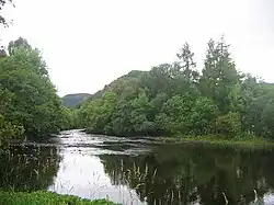 The island is flat and lies between two arms of the Black Water. It is wooded at the northern and southern ends and at the centre is the parish church of Contin, dedicated to St Maelrubha or Máel Ruba and the old manse, surrounded by farm land. There has probably been a church on this site since the 7th or 8th century and there is a reference to it in 1227. The present church building dates from 1490, the former church having been burned by the MacDonalds sometime between 1482 and 1488. It was repaired and altered around 1832. There are two stones in the churchyard dating to about 1200.[1][2][3]