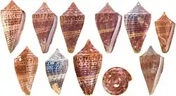 | Several shells of Conus planiliratus, seen as reversed images photographed under UV light | |