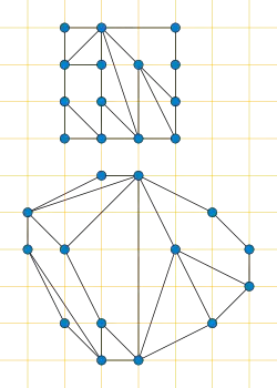 Every polyhedral graph has a strictly convex drawing,[1] for instance obtained as the Schlegel diagram of a convex polyhedron representing the graph. For these graphs, a convex (but not necessarily strictly convex) drawing can be found within a grid whose length on each side is linear in the number of vertices of the graph, in linear time.[2][3] However, strictly convex drawings may require larger grids; for instance, for any polyhedron such as a pyramid in which one face has a linear number of vertices, a strictly convex drawing of its graph requires a grid of cubic area.[4] A linear-time algorithm can find strictly convex drawings of polyhedral graphs in a grid whose length on each side is quadratic.[5]