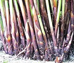 Convolute as a verb literally means to "roll together" or "roll around", from the Latin convolvere. In general application the word can mean to "tangle" or "complicate", but in botanical descriptions convolute usually is an adjective from the Latin convolutus, meaning "rolled around".[1] It commonly refers to a special class of imbricate structures — those where the overlapping edges of leaves, scales or similar elements are spirally wrapped, each scale having one edge within the previous scale and one outside the next scale. In the family Restionaceae the leaf sheaths commonly are convolute in this sense.[2] However in structures such as a spathe, where there is only one element, a convolute (or "convolutive") element is spirally wrapped around itself or its branch.[1] This is common in the buds of leaves and inflorescences of members of the family Araceae.