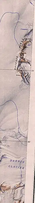 79°12′S 155°48′E / 79.200°S 155.800°E. A large, mainly ice-free ridge near the polar plateau in the west part of the Cook Mountains. The ridge is in the form of an arc, extending northwest from Mount Ayres. Named by US-ACAN for Cdr. H.K. Butcher, USN, air operations officer on the Staff of the U.S. Naval Support Force, Antarctica, during USN OpDFrz 1963 and 1964.[27]