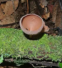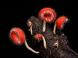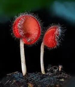 Cookeina is a genus of cup fungi in the family Sarcoscyphaceae, members of which may be found in tropical and subtropical regions of the world. Species may be found on fallen branches of angiosperms, trunks, and sometimes on fruits.[2] The Temuans of Peninsular Malaysia are reported to use certain species from this genus as food, and also as a bait for fishing, where it is rubbed against the hook.[3]