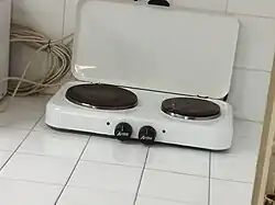 A hot plate or hotplate is a heated flat surface on a stove or electric cooker on which food may be cooked.[3] It comprises a heated top which is flat and usually circular, and may be made of metal, ceramic, or heat-resistant glass, with resistive wire forming a heating element fitted underneath and a thermostat to control the temperature. An electric current is passed through the wire, heating it; the thermostat controls the temperature the top reaches.