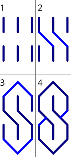 - The Cool S is started by drawing three short vertical lines, parallel and evenly-spaced, and then drawing another, identical group of three lines below them, separated by a gap the same length as each line segment. On a Cartesian coordinate system, these segments can be described as (0,4)–(0,3) / (1,4)–(1,3) / (2,4)–(2,3) and (0,2)–(0,1) / (1,2)–(1,1) / (2,2)–(2,1).