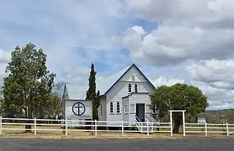 Our Lady of Sacred Heart Catholic Church opened on Sunday 11 September 1938 on land donated by Mrs Mary Gertrude O'Brien.[24][25] It was at 152 Cooranga North Niagara Road (26°45′24″S 151°24′20″E / 26.7566°S 151.4056°E).[26][27] On 28 June 2017 in the middle of the night, the church building was relocated to St Thomas More College in Sunnybank, Brisbane, where it is used as the school's chapel.[28][29] The relocation required two trucks, one for the church body and another for the roof, and the journey was 380 kilometres (240 mi).[26][30][31]