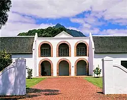 Behind two rows of three arches connecting two of the original sheds, stands a unique double-storey dovecote. The facade is a feature of the Cape architecture. In 1966 this dovecote was declared a monument. In the William Fehr Collection there is a sketch from 1896 by A.F. Truter of the dovecote.[7]