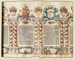 The Book of Esther prescribes "the sending of portions one man to another, and gifts to the poor".[66] According to halakha, each adult must give at least two different foods to one person, and at least two charitable donations to two poor people.[67] The food parcels are called mishloach manot ("sending of portions"), and in some circles the custom has evolved into a major gift-giving event.[68]