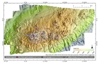 The surface of the seamount is formed mainly by outcropping basaltic bedrock while sediment deposits are of secondary importance. Outcropping rocks are weathered and often altered by biological activity: sediments occur mainly in depressions[13] and are largely absent on the upper part of the seamount.[14] Most of the sediments appear to originate locally, either from biological activity or as carbonates.[15] Antiforms, gullies and scarps occur on the seamount, the latter are evidence of past submarine landslides or mass wasting phenomena.[7]