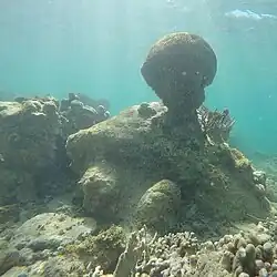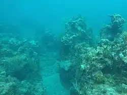 One of the marine ecosystems found in the U.S. Virgin Islands are the coral reefs. These coral reefs can be located between the islands of St. Croix, St. Thomas, and St. John. These coral reefs have an area of 297.9 km2, along with other marine habitats that are in between.[2] The way these coral reefs grow are by coral larvae swimming freely and attaching themselves to hard surfaces around the islands and start to develop a skeleton on the outside of their skin to protect themselves from predators but also allow a new place for other coral larvae to attach to and grow on.[3] These corals can form into three different structures; fringing reefs, which are reefs that are close to the shore, barrier reefs, which are reefs that are alongside the shore and is separated by deep water, and an atoll reef which is a coral reef that circles a lagoon or body of water.[1]