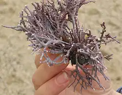 Geniculate corallines are branching, tree-like organisms which are attached to the substratum by being crustose or possessing calcified, root-like holdfasts. The organisms are made flexible by having non-calcified sections (genicula) separating longer calcified sections (intergenicula). Nongeniculate corallines range from a few micrometres to several centimetres thick crusts. They are often very slow growing, and may occur on rock, coral skeletons, shells, other algae or seagrasses (being epiphytes). Crusts may be thin and leafy to thick and strongly adherent. Some are parasitic or partly endophytic on other corallines. Many coralline crusts produce knobby protuberances ranging from a millimetre to several centimetres high. Some are free-living as rhodoliths (rounded, free-living specimens). The morphological complexity of rhodoliths enhances species diversity, and can be used as a non-taxonomic descriptor for monitoring.[9]