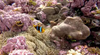 Fresh surfaces are generally colonized by thin crusts of coralline algae, which are replaced by thicker or branched forms during succession over the course of one (in the tropics) to ten (in the Arctic) years.[21] However, the transition from crusts to branched form depends on environmental conditions. Crusts may also become detached and form calcareous nodules known as Rhodoliths.[28] Their growth may be also disrupted by local environmental factors.[29] While coralline algae are present in most hard substrate marine communities in photic depths, they are more common in higher latitudes and in the Mediterranean.[30] Their ability to calcify in low light conditions makes them the some of deepest photosynthetic multicellular organisms in the ocean,[31] having been found as deep as 268 metres (879 ft),[32] and as such a critical base of mesophotic ecological systems.[33][34]