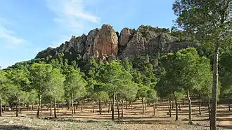 The landscape varies significantly, featuring: - Northern slopes, where most settlements are concentrated, adjacent to irrigated agricultural lands. - Mountainous zones, covered with Mediterranean forests on peaks and shaded areas. - Southern slopes, which are arid, featuring the so-called "Lunar Landscape" (Paisaje Lunar). - Dry farming areas, primarily growing almonds and olives in the mountain passes.