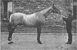 Corlay is reputed to have been very fertile.[23] He sired a large number of offspring who excelled as carriage horses, racehorses and saddle horses, and are renowned for their distinction,[27] quality, model and ability.[23] Famous descendants include the stallion Voltaire, son of the mare Mina, herself by the Thoroughbreds Éperon and Sting, and the Arab Kérim.[17] Voltaire rode for the Huon brothers throughout Brittany, Normandy and at Vincennes, earning a total of over 20,000 francs according to Louis Cauchois.[28] Count de Robien owned descendants of Corlay, including Focking, ex Daman.[10] M. Le Gualès de Mézaubran is reputed to have owned Breton Norfolk horses from Corlay, of roan-auberized coat, "which jumped remarkable heights in Paris".[10] Lionel Bonnemère testified in 1901 that a member of his family had found a horse in the stables of the Royal Palace in Madrid, billed as the favorite of King Alfonso XIII, which turned out to be a son of Corlay.[29] Other stallions, bearing the names Atao, Glazard, Martial, Grippesou, Innachus and Corlay II, are cited as his descendants.[4][30] His son Gladi, owned by Count Le Gualès de Mézaubran, is said to have won numerous prizes under saddle, in driving and jumping, notably in 1889.[11][31]