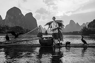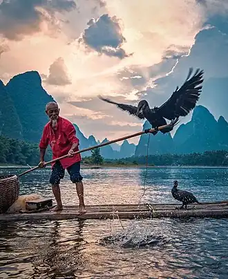 In Guilin, Guangxi, cormorants are famous for fishing on the shallow Lijiang River.[4] Elsewhere in southern China, the Bai people have utilized cormorant fishing since the 9th century on the banks of Erhai Lake. Traditionally practised for sustenance, cormorant fishing is now primarily performed for tourists.[6]