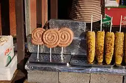 Masala bhutta (Hindi: मसाला भुट्टा, lit. '"spice corn"') is a popular Indian street food. It is prepared by grilling corn, then adding lime juice and a masala (spice) mix.[20]