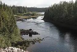 Only the first 9.3 kilometres (5.8 mi) of the river is readily accessible to salmon, which cannot pass a waterfall 5.6 metres (18 ft) high at the confluence of Lake Tanguay and the Corneille River. In 2014 a program funded by Hydro-Québec as part of the development of the Romaine River hydroelectric project built a path by which the salmon could pass this obstacle. Controlled blasting in the bedrock created an excavated channel near the left bank that carried about 10% of the river's flow to create a salmon run. This gave the fish access to an additional 60 kilometres (37 mi) of the river, and reduced the time they spent at the foot of the falls, where they were at risk of poaching.[10]