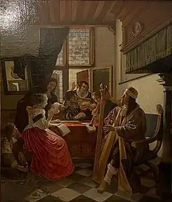 He was back in 1653 and stayed in Delft, where he created genre works that are reckoned to be "of the "Pieter de Hooch" school.[1]