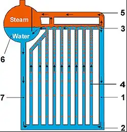 The water flows down from the drum (6) through the down comers (7) and it is distributed in the different riser tubes(4). The steam-water mixture circulates and flows in the upward direction through the riser tubes. In the radiation heated area through the pre-separator (also known as cross-collector) (3) occurs the pre-separation of steam from the steam water mixture. The separated steam flows through the overhead pipe (5) and the steam-water mixture flows through the collector pipe (3) to the drum (6) as well. In the drum occurs the final separation of steam from steam water mixture. The rest amount of water flows through the unheated return tubes (1) and downcomers (7) to the rear wall distributor/header (2). Due to the water returning from the unheated downcomers (1) a lively circulation takes place .[7]