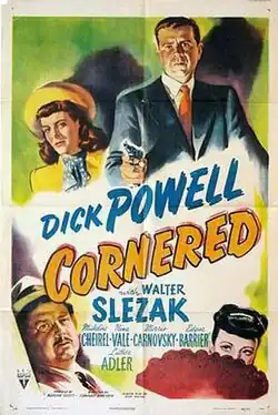 Cornered is a 1945 American mystery thriller film noir starring Dick Powell and directed by Edward Dmytryk.[2] This is the second teaming of Powell and Dmytryk (after Murder, My Sweet).[3] The screenplay was written by John Paxton with uncredited help from Ben Hecht.